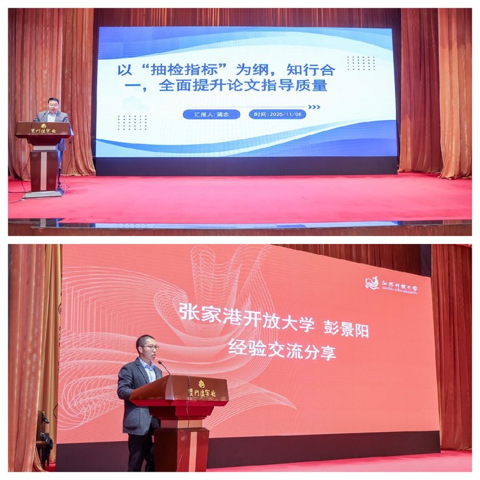 在经验交流环节,吴中开放大学继续教育学院副处长蒲忠、张家港开放大学彭景阳老师分别分享了自己在担任课程导师和进行学生论文指导等方面的经验做法。